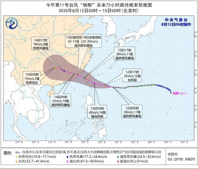 本年第11号台风“杨柳”(强热带风暴级)的核心今天(8月12日)晚上5点钟位于台东市东偏南标的目的大约780公里的西北承平洋洋面上,就是北纬21。0度、东经128。5度,核心附近最大风力11级(30米/秒),核心最低气压980百帕,七级风圈半径为160~220公里,十级风圈半径为50~80公里。